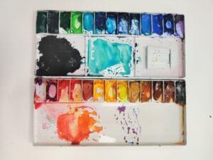 When I am painting with watercolour, I use two pots of water. One for washing out brushes, which become dirty quickly, and the other for adding clean water to my paint. I also have a small spray bottle on hand to hydrate the paint when it starts to dry out.