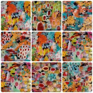 I work on all nine canvases at the same time using the chosen colour palette and working in layers. I select a red, a blue and a yellow which forms the foundation of my collection. And then I play. Once I have all the pieces looking good, I will introduce small amounts of a different colour depending on what I feel each piece needs. Finally, I add gold leaf circles. It takes months to pull together a collection: some years I only produce one and others I can manage three.